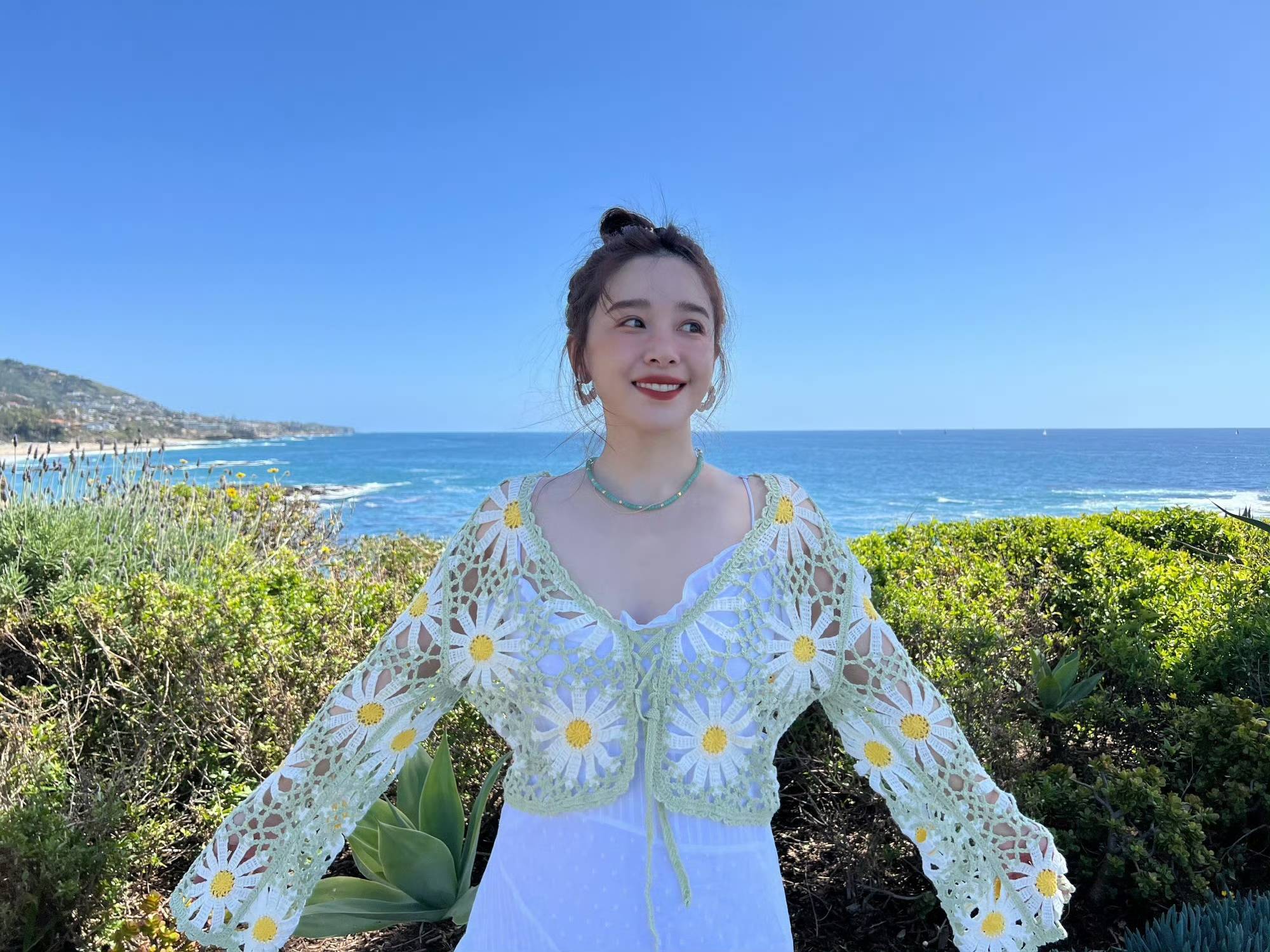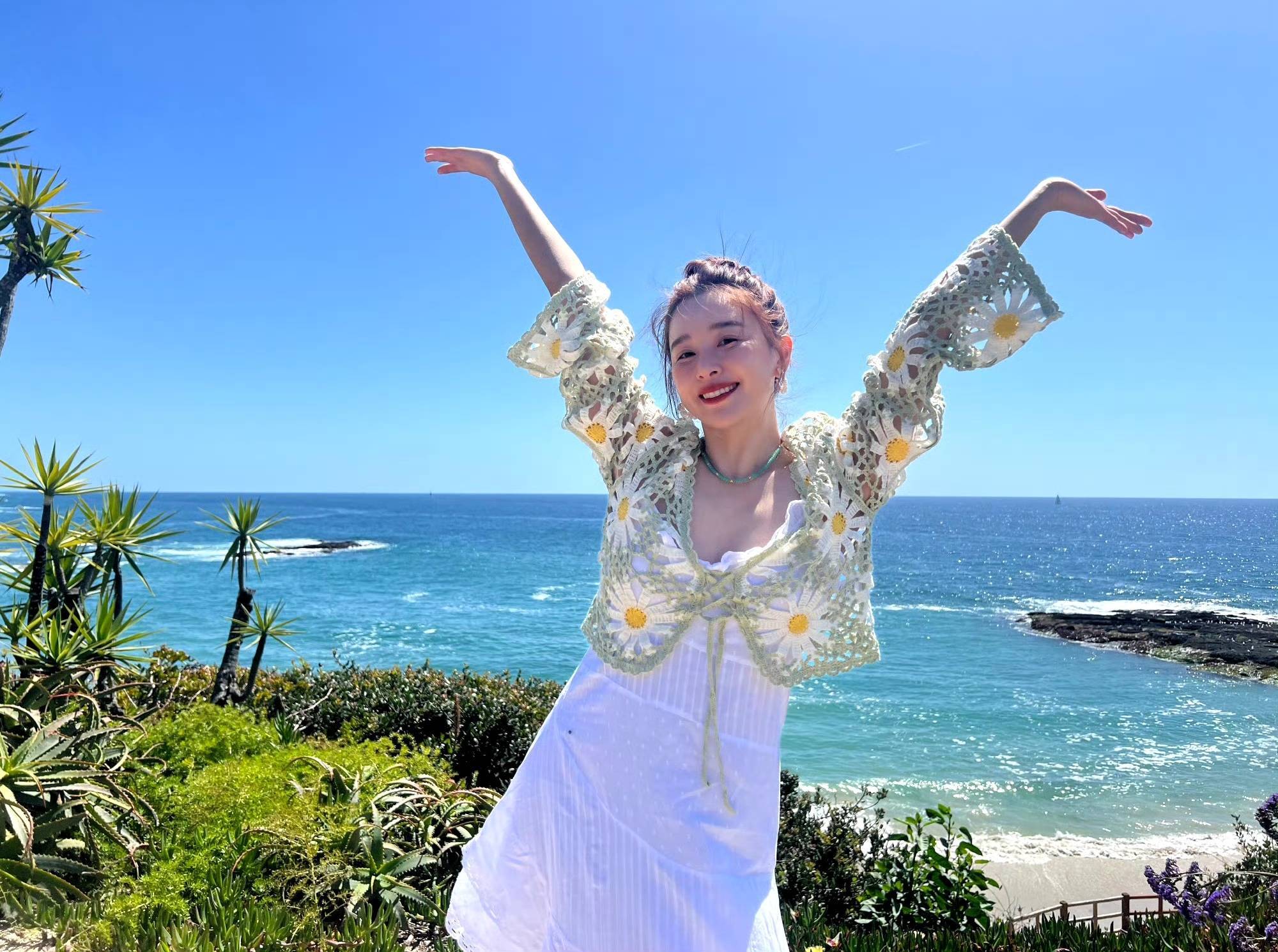 这组照片里的阚清子完全颠覆了以往的荧幕形象。你能想象吗?那个在《亲爱的自己》里倔强又敏感的职场女性,转身就成了海边最灵动的精灵。白裙外搭的黄色雏菊针织开衫简直是神来之笔,镂空花纹在阳光下若隐若现,既保留了少女感又多了几分法式慵懒。她站在礁石上张开双臂的样子,像要把整片大海拥入怀中,笑容比浪花还要耀眼——原来真正的松弛感,是连阳光都愿意为她镀上一层金边。